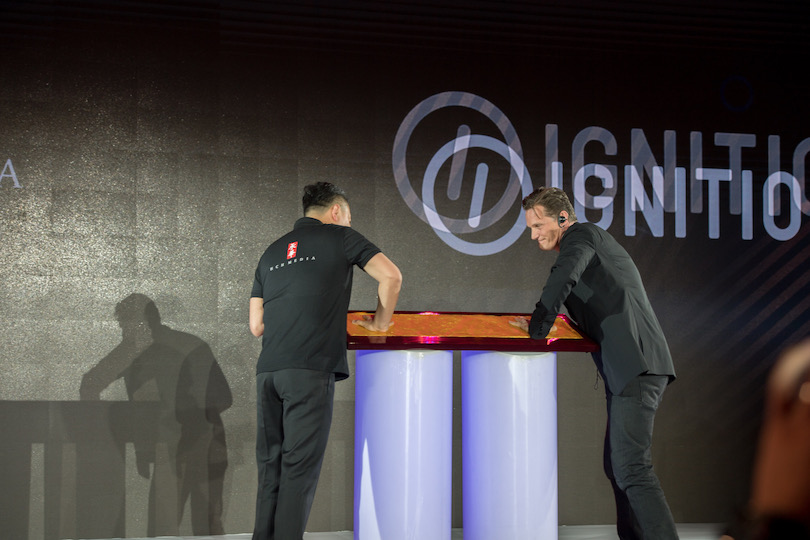 在宏大而震撼的开场视频中,发布会拉开了帷幕。随后,HCH创始人、CEO梁龙飞先生出席致辞,为在场嘉宾详细介绍了公司的业务架构及未来的全球化战略布局,并请出重要合作伙伴——IG创始人、CEO马丁·基斯特勒(Martin Kistler),宣布HCH与IG的合资公司Ignition China(以下简称IC)正式成立。双方高层共同按下金手印,标志着HCH在全球化历程上迈出了重要的一步。